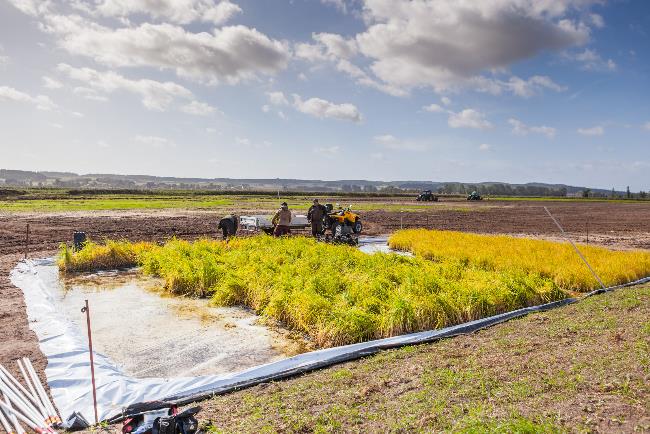 Im Anschluss erläuterten Greifswalder Wissenschaftler auf naheliegenden Ernteflächen, dass durch die Wasserstandsanhebung die CO2 -Emissionen reduziert wurden. Viele der Teilnehmenden nutzten im Anschluss die Gelegenheit, sich bei Neukalen die Einrichtung einer neuen Versuchsfläche des Paludi-PRIMA Projektes der Universität Greifswald anzuschauen. Hier werden auf 8 ha vernässtem Niedermoor Rohrkolben und Schilf gepflanzt, um Management, Ernte und Verwertung zu untersuchen. Die Demonstrationsfläche soll helfen, Paludikultur in die Praxis zu bringen und offene Fragen zu klären.