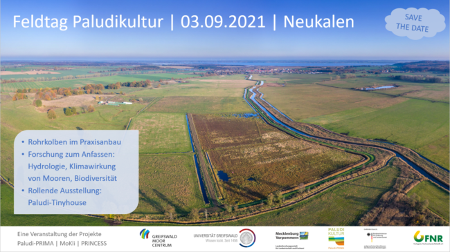 Zum „Feldtag Paludikultur“ lädt das Greifswald Moor Centrum am 03. September 2021 (11-15.00 Uhr) auf die Versuchsfläche des Paludi-PRIMA Projektes bei Neukalen in Mecklenburg-Vorpommern. Hier wird seit 2019 der Anbau von Rohrkolben (Typha) auf wiedervernässtem Niedermoor getestet. Beim Feldtag führt eine Tour über die 10 ha große Versuchsfläche. Wissenschaftler*innen berichten zu Anbauversuch, Hydrologie, zur Klimawirkung von Mooren und ihrer Biodiversität. Eine rollende Ausstellung im Paludikultur-Tiny House informiert zu den Verwertungsmöglichkeiten von Paludi-Biomasse.
